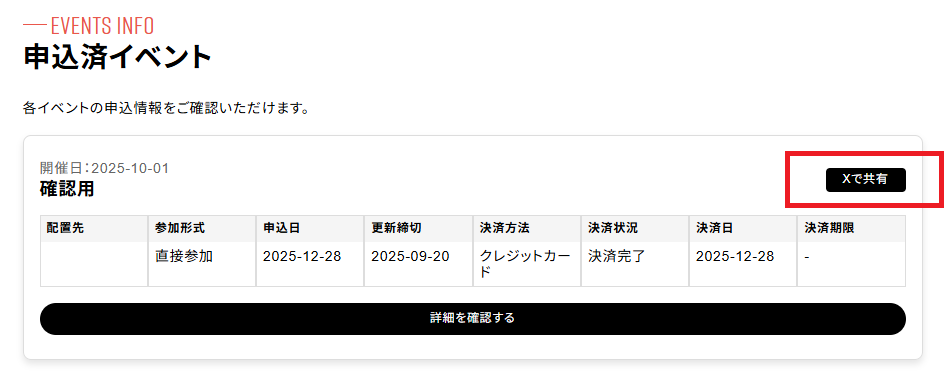 申込済イベントにある各イベントに「Xで共有」ボタンが表示されるようになります。
